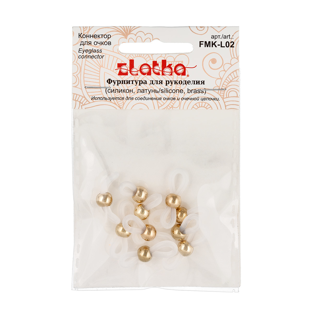 Коннектор для очков " Zlatka" FMK- L02 - это вид фурнитуры для бижутерии и аксессуаров, используемой для соединения очков и очечной цепочки. Подвижный шарик позволяет регулировать размер петли, надевающейся на дужку очков. Использование качественной фурнитуры играет очень важную роль при изготовлении бижутерии. От правильного выбора коннектора, замка или любой другой связующей части зависит целостность готового изделия. Размер 19. 5 мм. Толщина основы: 1. 8 ммШарик: 5. 9 х 4. 6 ммКоличество в упаковке: 10 шт. Состав: силикон, латунь. Сообщить о неточности в описании